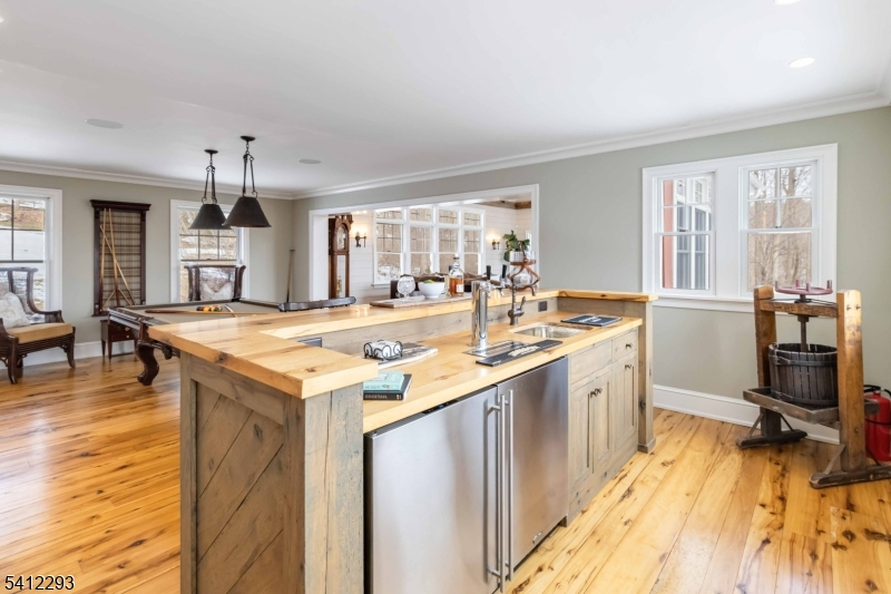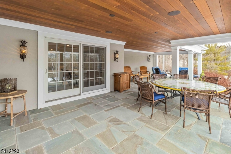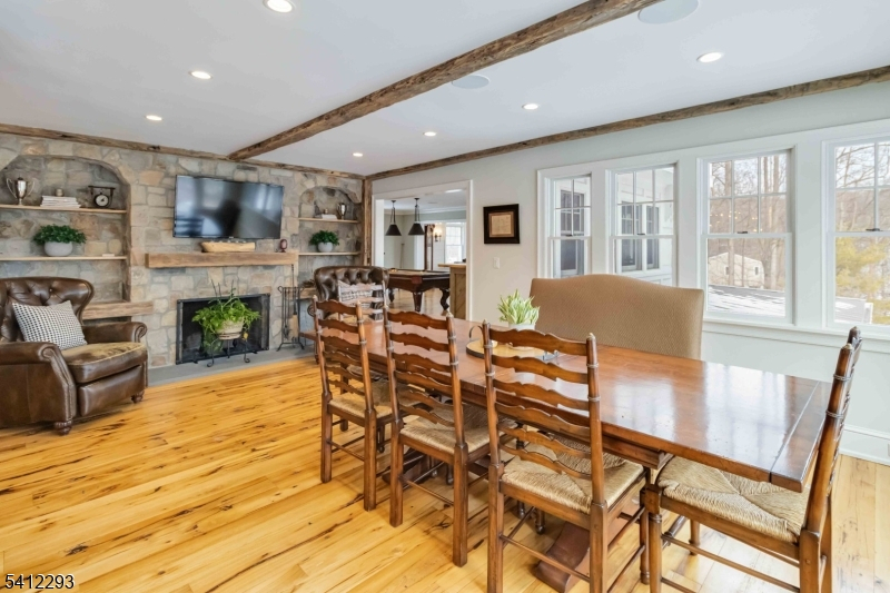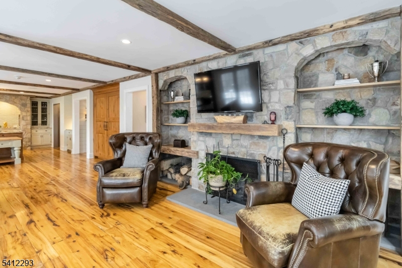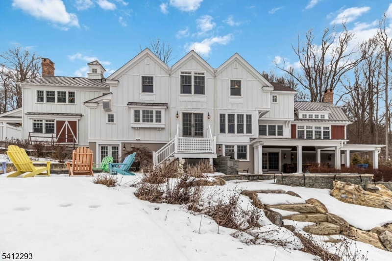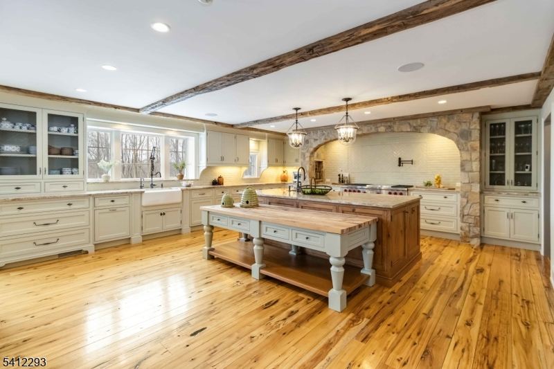 Exceptional, Fully Renovated Colonial in Serene Park-Like Setting. This spectacular 4 Bedroom Custom Colonial was completely renovated and expanded, and meticulously appointed with luxurious custom finishes including hand-hewn beams, reclaimed wide-plank hickory wood flooring, and beautiful stone work. A semi-open floor plan features generously sized rooms bathed in warm natural light, high ceilings and top-of-the-line appliances. The hub of the home is a show-stopping kitchen with all the bells and whistles: custom cabinetry, two large islands, hickory baker's table, dining area overlooking the pool and yard, separate walk-in pantry, sitting area with fireplace, full-size SubZero refrigerator and freezer, and SO MUCH MORE! The second level features a private primary suite with an office, 2 walk-in closets and stunning marble primary bath with radiant heat. Walk-out lower level with second kitchen, full bath, rec room, gym and more. Situated on just over 3 acres and backing up to preserved park land, this home offers a restful retreat with great outdoor space: expansive stone patios, heated pool and hot tub with waterfall, outdoor gas BBQ, fire pit, gardens and great views. See feature sheet for additional details. A true show-stopper!
