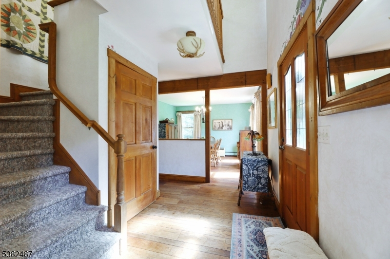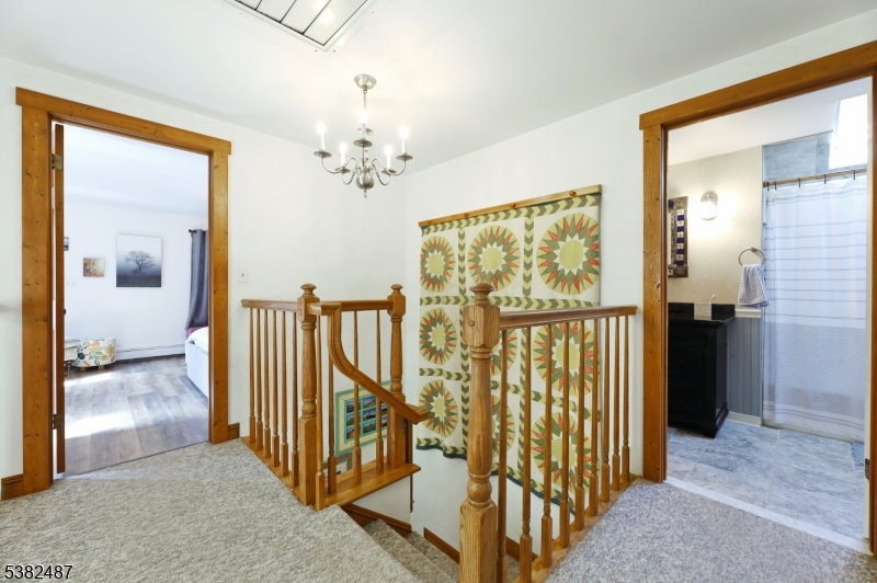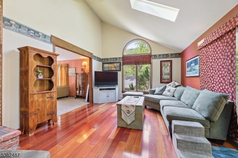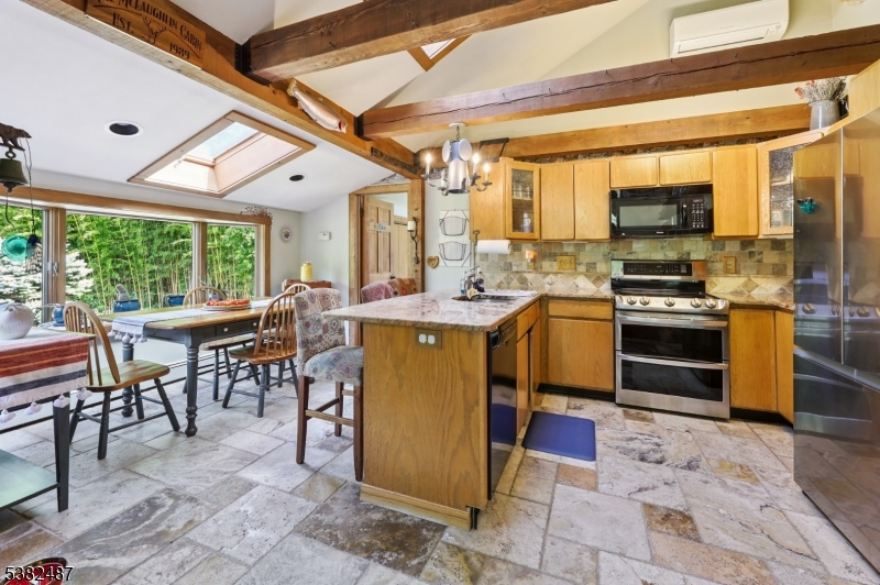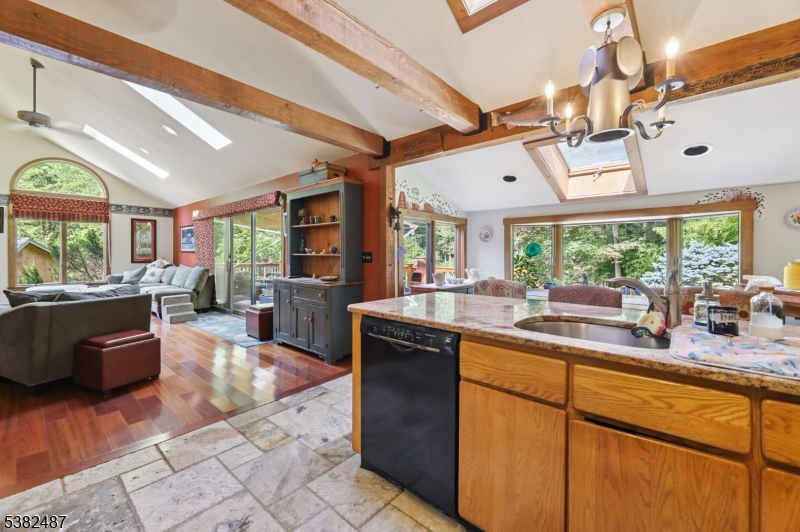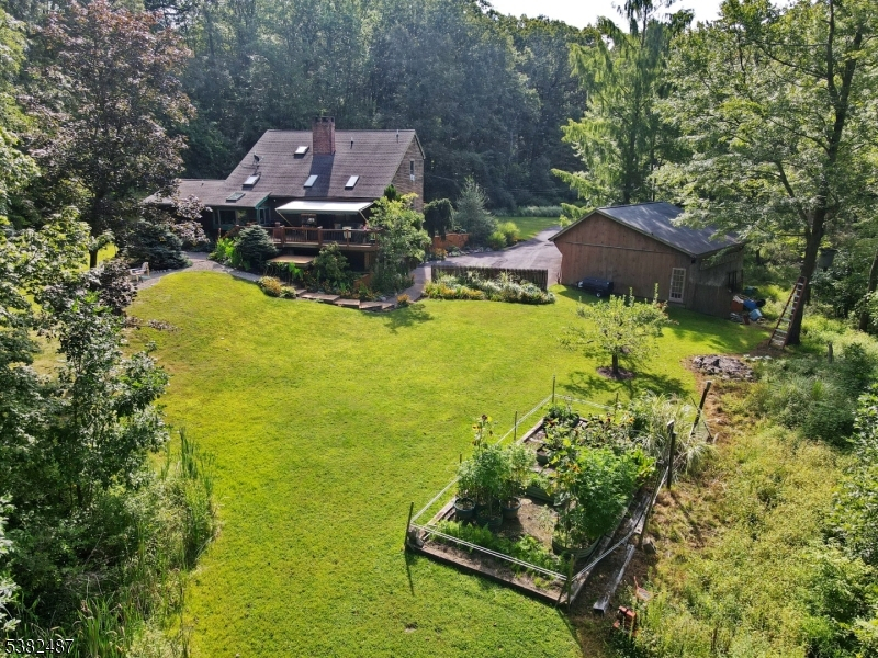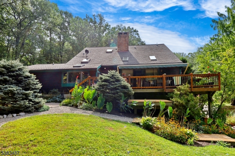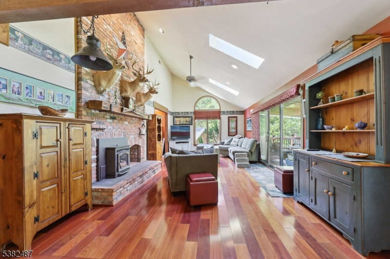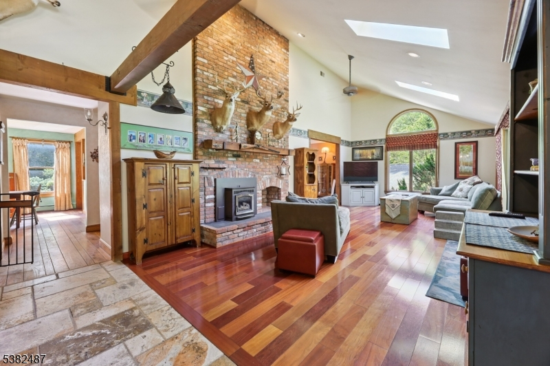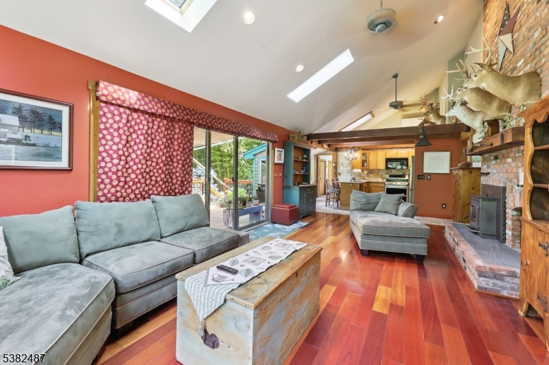 Custom Contemporary Home on your own private lot! Built with Pride and integrity, truly one of a kind! Discover this custom home, perfectly tucked away for privacy & peaceful living. Step inside to a bright, open floor plan featuring a large living room w/ Brazilian hardwood floors, soaring vaulted ceilings, skylights, and floor to ceiling brick fireplace with pellet stove insert. Sliding glass doors leading to a spacious deck with retractable 18ft awning, perfect for relaxing or entertaining, plus a lower deck ideal for a small pool or hot tub. Open concept country-style kitchen offers granite countertops, tile floor, exposed beams, a breakfast bar, and a sun filled eating area with large bay window and skylights, overlooking expansive backyard. First floor also includes a formal dining room, separate living room, bedroom, full bath, and convenient laundry room. Upstairs features an open hallway leading to two generously sized bedrooms and full bath. Ground-level basement with high ceilings, a wood burning stove, sliding glass doors, and access to outdoor living space. This versatile area offers excellent potential to be finished into additional living space. Additional highlights include three zone heating, ample parking, and detached two and half bay carriage shed/style pole barn. Don't miss this unique opportunity!